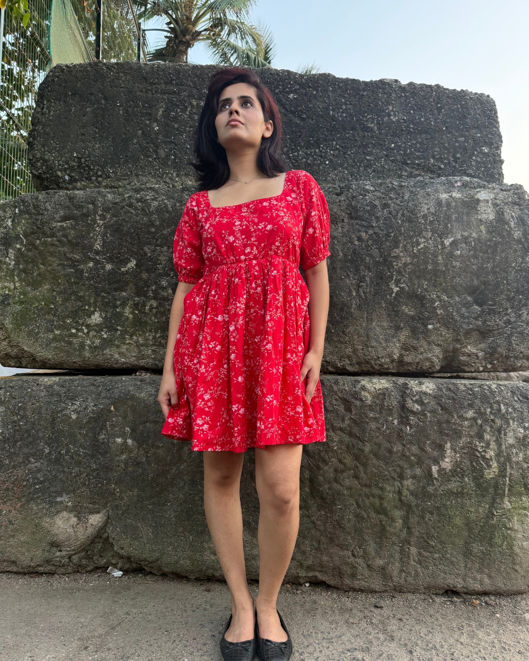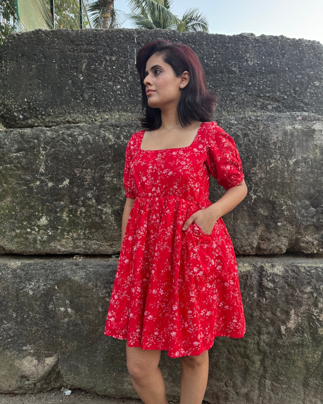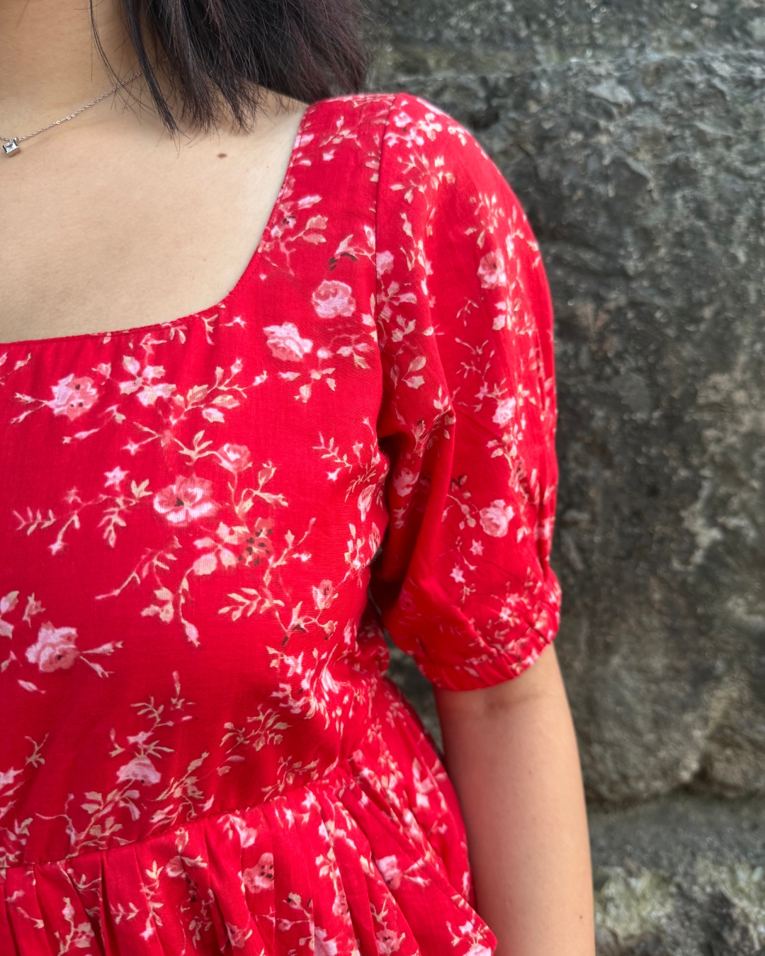 This vibrant red floral dress is the perfect mix of playful charm and timeless femininity. The dress features a clean, structured square neckline that beautifully frames the collarbone, complemented by voluminous puff sleeves that add a touch of vintage romance. The silhouette is designed to flatter, with gentle shaping through the bodice and a concealed back zip for a snug, contoured fit. Whether worn as a statement piece or styled simply for everyday elegance, this dress blends artisanal richness with effortless femininity.