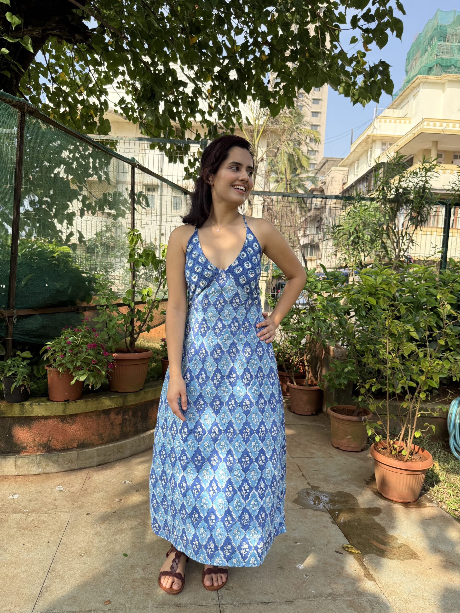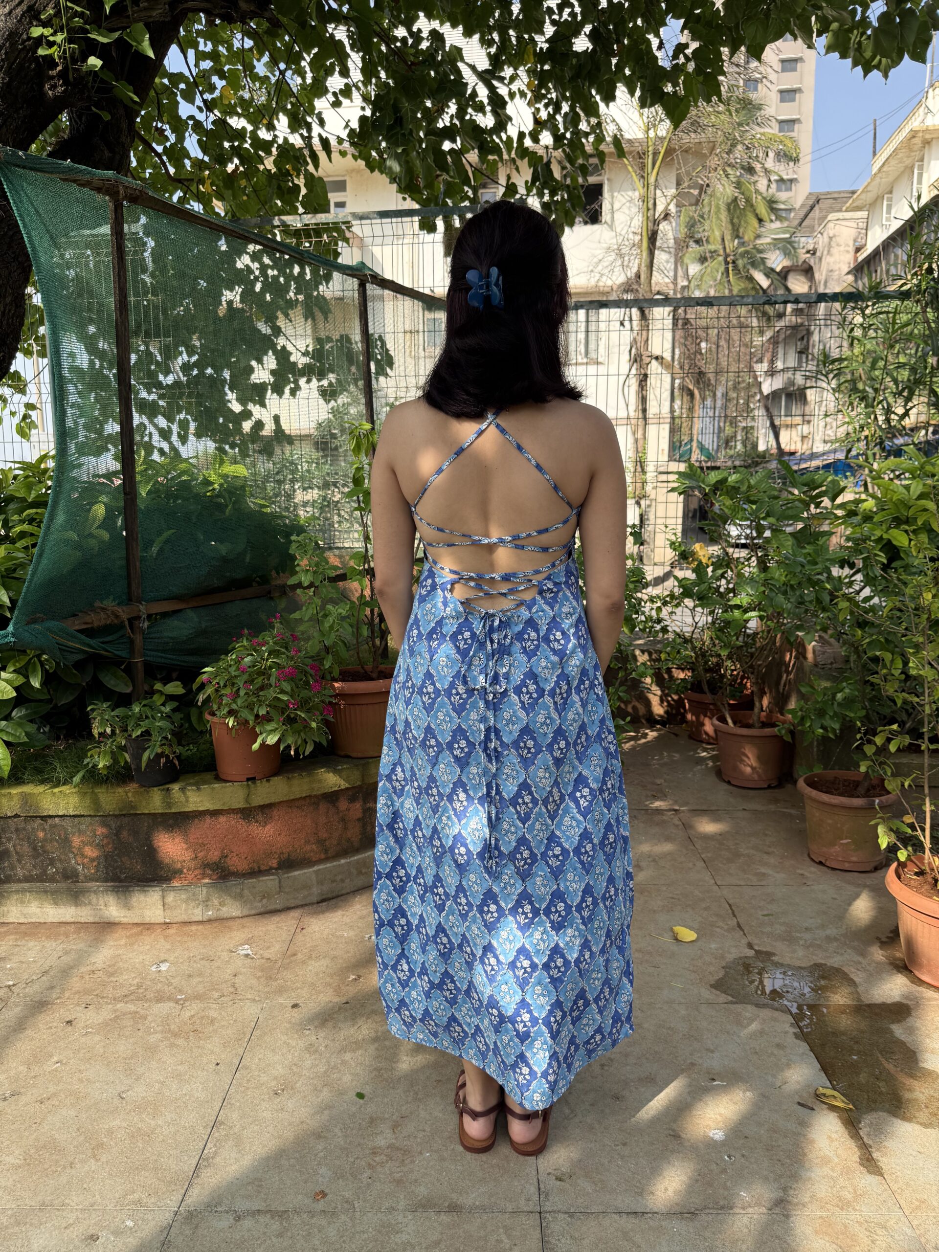 An expression of artistry and balance, the Madhurya Blue Muse Dress is handcrafted from pure Bagru-printed cotton using two complementing fabrics that flow together in harmony. The flattering neckline and backless silhouette with adjustable strings ensure a graceful, feminine fit. Designed to stand out with its timeless prints and effortless drape, this dress embodies contemporary heritage.