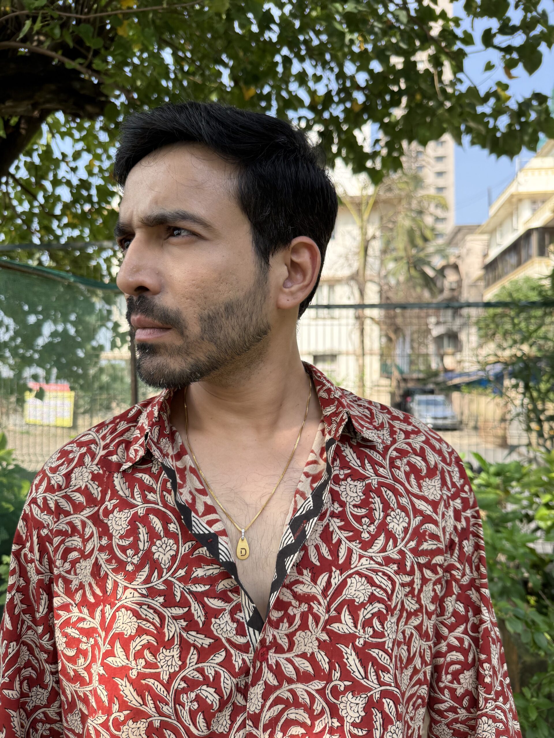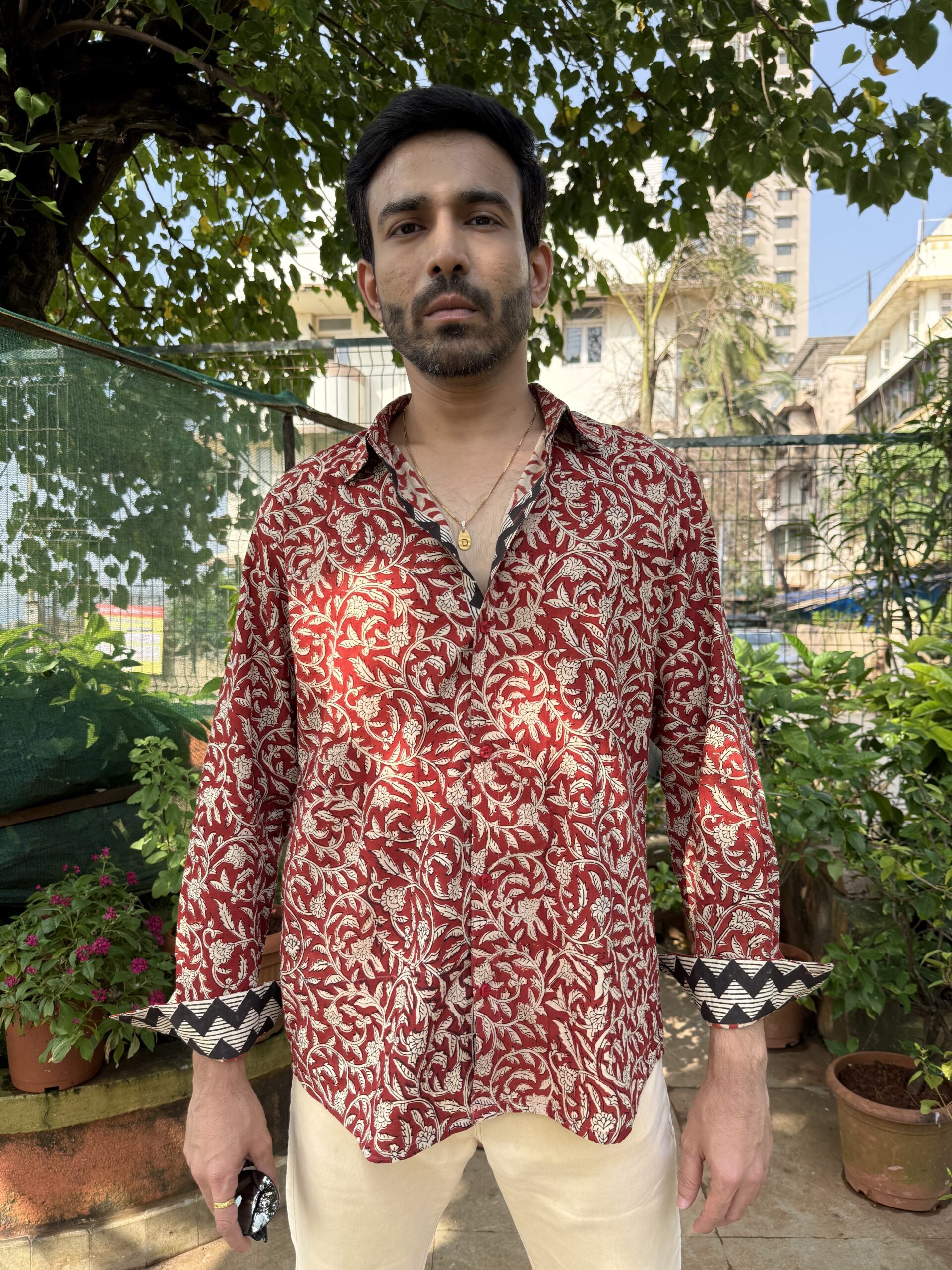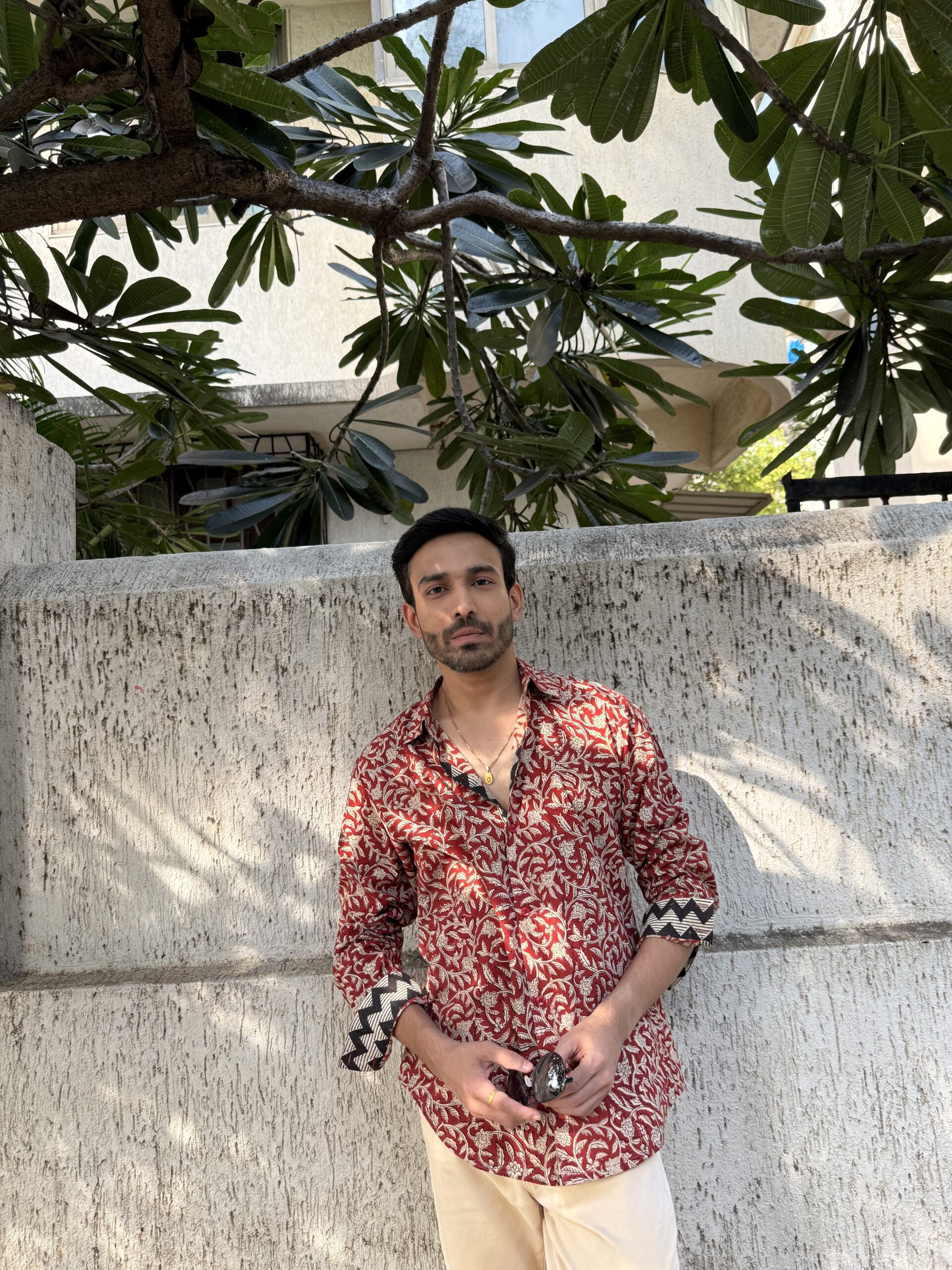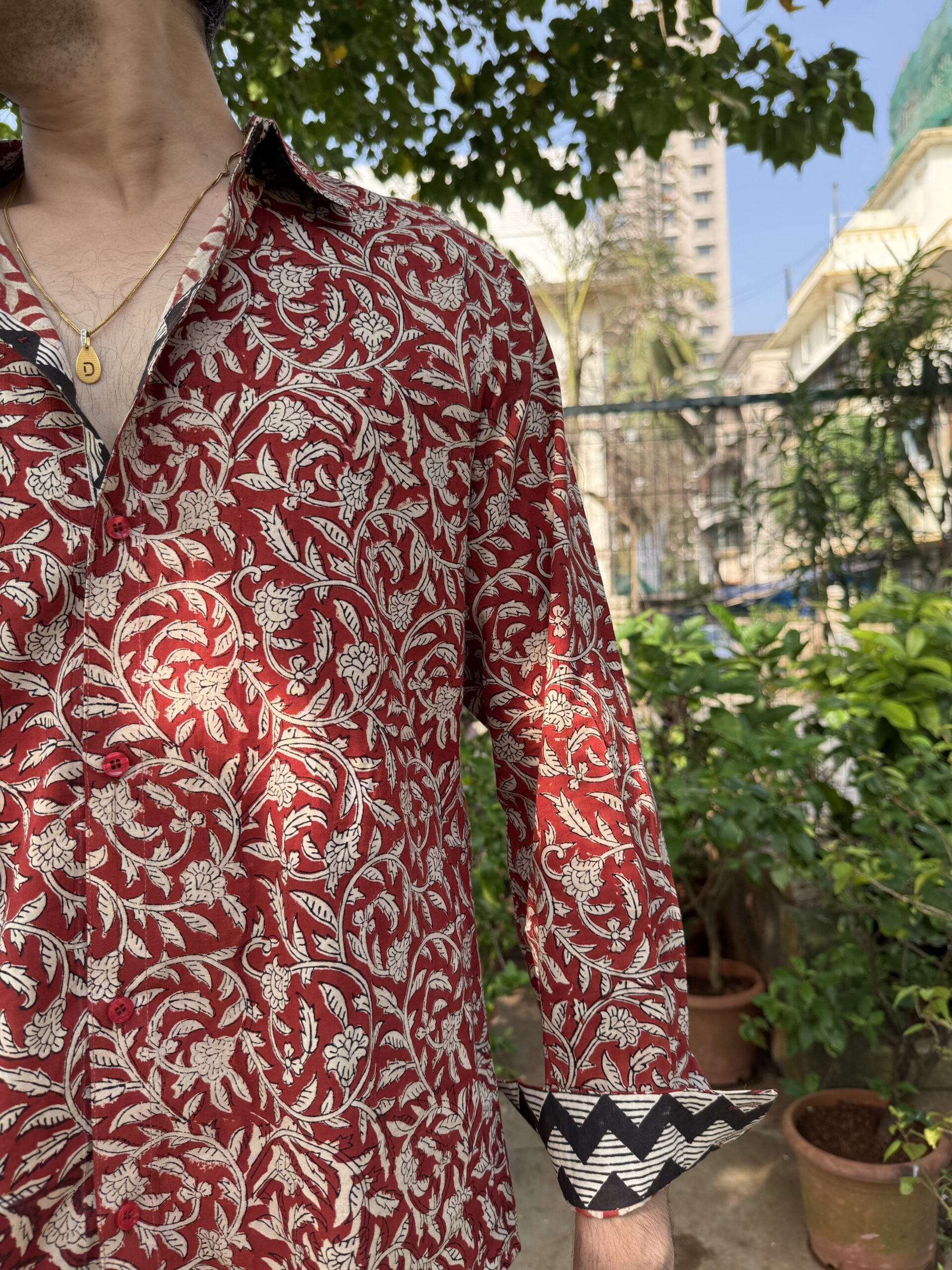Crafted in pure cotton and hand block printed with intricate motifs, the Madhurya Crimson Vine Shirt brings together art and sophistication. The contrasting fabric on the cuffs and button strip adds a refined touch to its traditional design, making it perfect for both relaxed days and statement evenings. Lightweight and breathable, this shirt redefines comfort with timeless craft.
