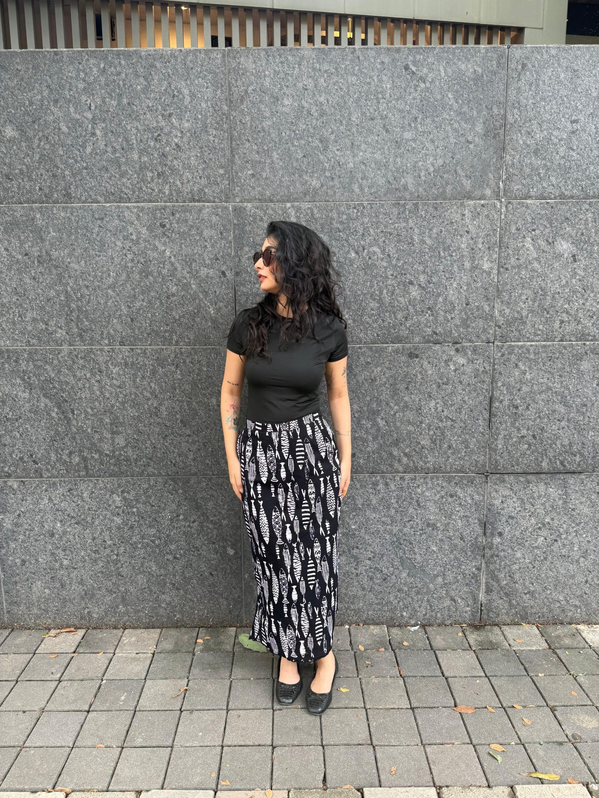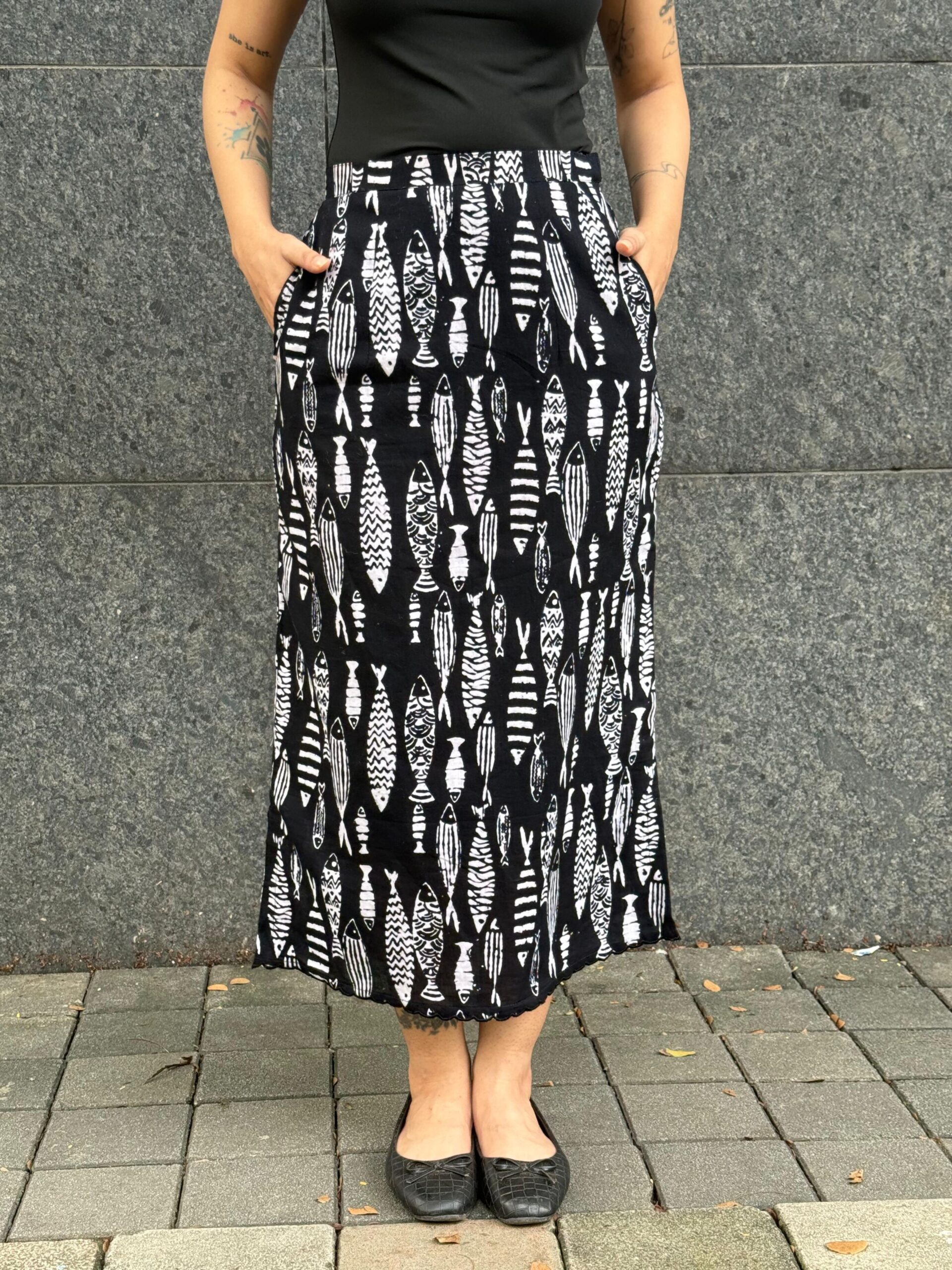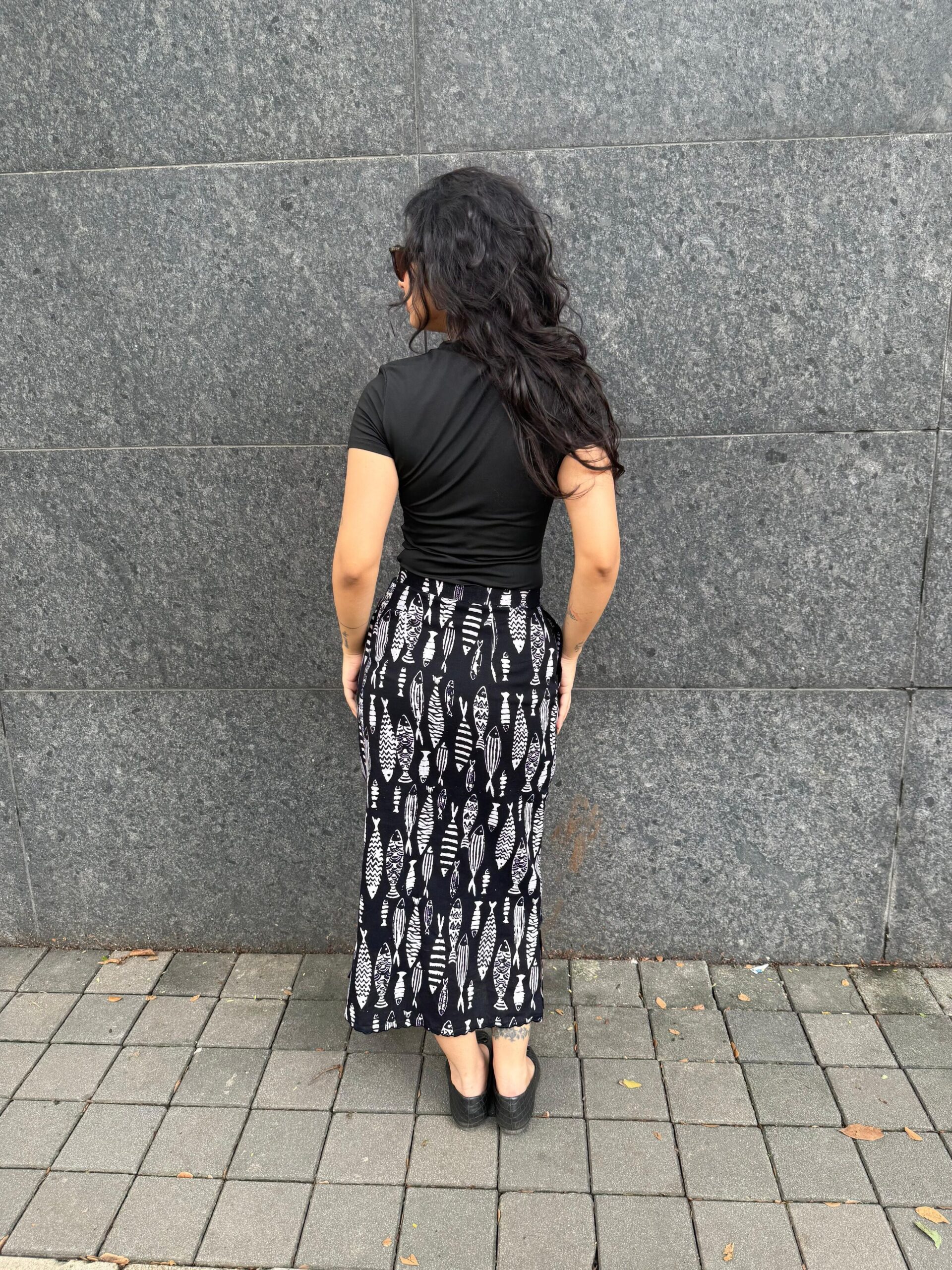 The monochrome palette makes it easy to pair with a variety of tops, while the quirky fish print adds a touch of fun and uniqueness. Crafted from breathable cotton fabric, it’s perfect for everyday wear, travel, or casual outings.