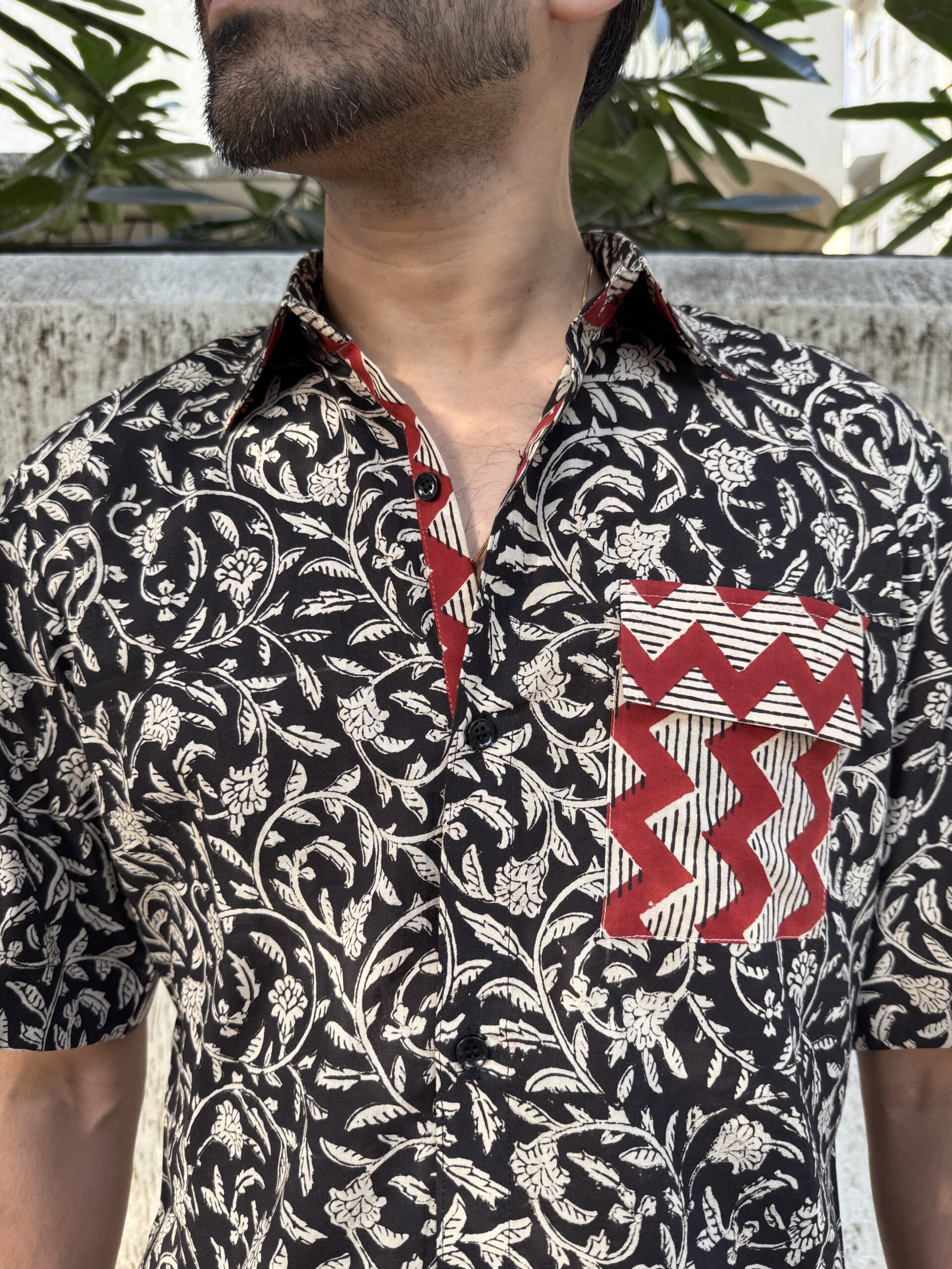 Blending heritage craft with modern tailoring, the Madhurya Raga Red Shirt features half sleeves and a contrast fabric detail on the pocket and button strap. Made from hand block printed cotton, this shirt offers breathable comfort and effortless style — a versatile piece for casual days or festive evenings.